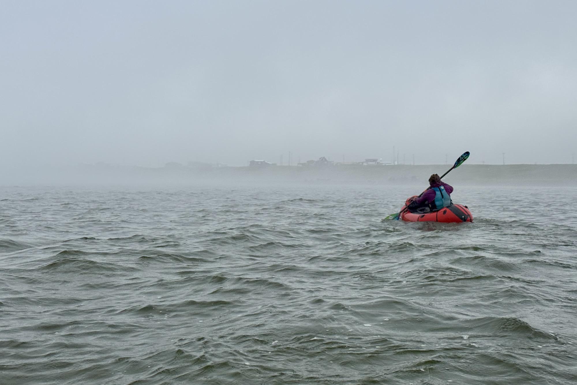 We pulled out our packrafts to cross a gap in the island and again to cross the island to the new location of the village of Point Lay. The original village, Kali (Iñupiat: mound), was located on a mound on the barrier island. The village moved across the lagoon to avoid flooding hazards 20 or 30 years ago.