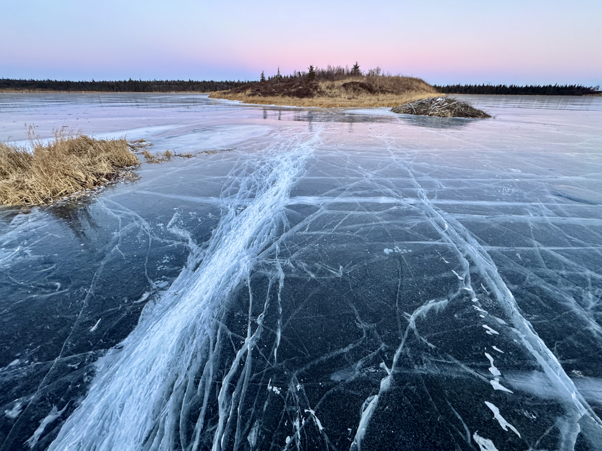 We started the trip the next morning at 9:00 AM, a full 90 minutes before the sun crested above the horizon. Low clouds reflected the sun’s light well before we could see it, creating an orange sky over purple ice. The ice was strong, at least 8 inches (20 cm) thick, and smooth enough. One of my first observations was that it would be hard not to get complacent on such thick ice. This turned out to be true. But first, we got to skate on a bunch of incredible ice.